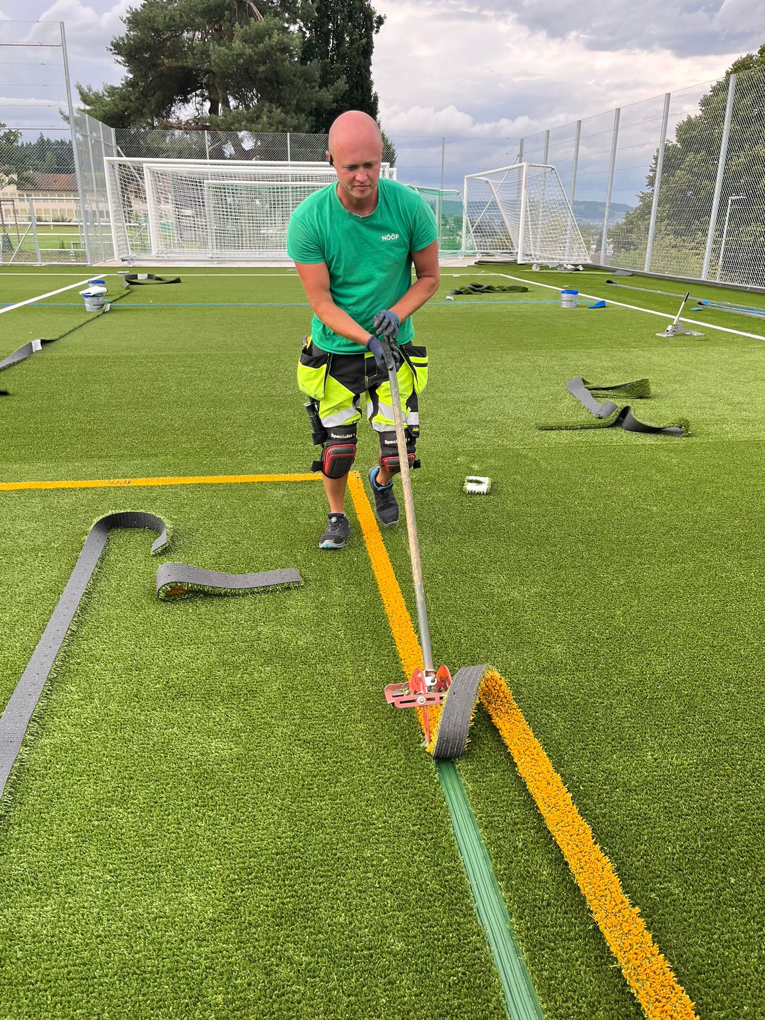 Am 22. Juli 2025 traf der Kunstrasenteppich in Willisau ein. Ausgeladen, ausgerollt und nun wird er fachmännisch vom vierköpfigen «Bodenlegerteam» verlegt. Die Arbeiten dauern die nächsten Tage an. Am 22./23. August 2025 wird der Kunstrasenplatz mit einem Fest eingeweiht und seiner Bestimmung übergeben.
